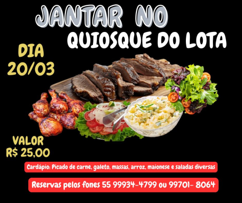 Cardápio: Picado de carne, galeto, massas, arroz, maionese e saladas diversas ao valor de R$ 25,00