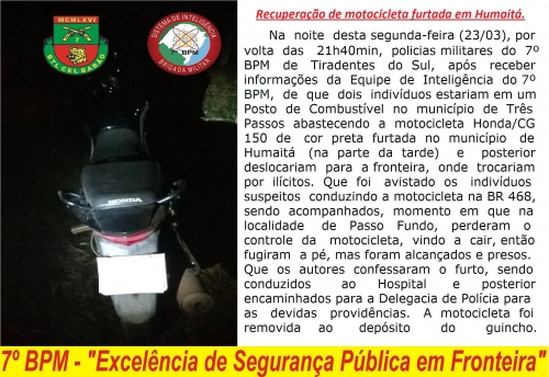 Motocicleta foi recuperada em Tiradentes do Sul
